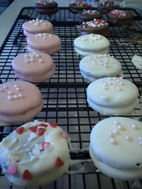 So, since it is spring break, I thought it would be fun to make some spring treats with the girls. Here is my attempt at white chocolatedipped oreos. I tried to say T hearts V, but I don't have a very steady hand. They still turned out cute, though! And Vaughn ate them all. :)
